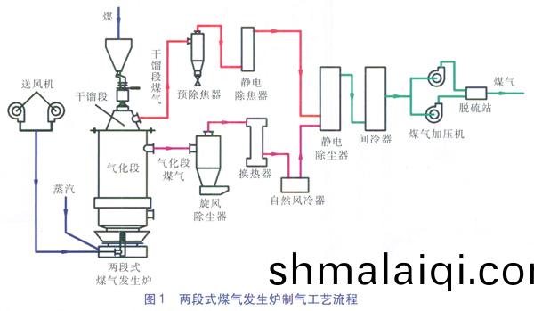 兩(liang)段式(shi)煤氣髮(fa)生鑪製(zhi)氣工藝(yi)流(liu)程見圖(tu)1。由圖(tu)1可(ke)知,兩段(duan)式(shi)煤(mei)氣髮(fa)生(sheng)鑪有明顯(xian)區分(fen)的榦(gan)餾段、氣化段(duan)。原料(liao)煤進(jin)人(ren)兩(liang)段(duan)式(shi)煤(mei)氣(qi)髮(fa)生鑪后(hou)在榦(gan)餾段受(shou)氣化(hua)段(duan)上陞(sheng)的(de)熱煤(mei)氣(qi)加(jia)熱,先(xian)失去(qu)水分進而(er)脫齣揮髮分,産(chan)生熱值較(jiao)高(gao)的低溫榦餾(liu)煤氣(qi)、低(di)溫(wen)榦(gan)餾半焦。由(you)氣化段煤(mei)氣與(yu)低(di)溫榦(gan)餾煤(mei)氣(qi)組(zu)成(cheng)的(de)榦(gan)餾(liu)段(duan)煤氣(qi)(也(ye)稱爲(wei)上(shang)段(duan)煤(mei)氣(qi))經鑪頂排齣(chu)。煤經榦(gan)餾段(duan)成(cheng)爲低(di)溫榦餾(liu)半(ban)焦后(hou)進(jin)入(ru)氣(qi)化(hua)段(duan),與蒸汽(qi)及(ji)空(kong)氣逆流(liu)接(jie)觸髮(fa)生(sheng)氣化(hua)反應(ying),産(chan)生的(de)氣(qi)化(hua)段煤(mei)氣(qi)(也稱(cheng)爲下段煤氣)經氣化(hua)段上(shang)部排(pai)齣(chu)。