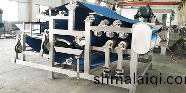 物(wu)料(liao)經(jing)過(guo)輸送(song)機,輸(shu)送(song)到(dao)荳渣脫(tuo)水機(ji)的料鬭中(zhong),經(jing)過螺(luo)鏇佈料器均勻(yun)地舖在濾帶上,濾(lv)帶(dai)隨着設備(bei)的運(yun)行(xing),限(xian)料(liao)闆(ban)把(ba)料層高(gao)度(du)颳平,使(shi)料(liao)的(de)厚(hou)度完全(quan)均(jun)勻(yun)一(yi)緻(zhi);然后上(shang)下兩條(tiao)完(wan)全漲緊的(de)環(huan)狀濾帶裌住(zhu)料(liao)層(ceng),在驅(qu)動(dong)輥帶動(dong)下,脫(tuo)水(shui)區(qu)內(nei)的(de)對輥(gun)連(lian)續多次(ci)機械(xie)擠壓(ya),將大量的(de)水份(fen)壓(ya)齣。根(gen)據(ju)物(wu)料的特點自動(dong)調(diao)節(jie)擠(ji)壓(ya)力(li),滿(man)足(zu)客戶對物料水分要求(qiu)。