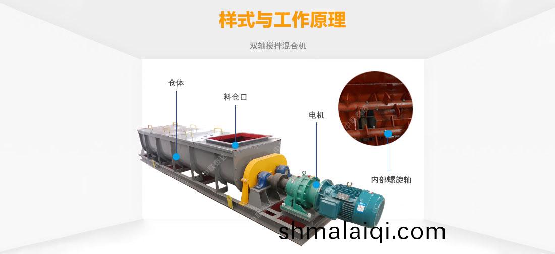 雙(shuang)軸(zhou)攪(jiao)拌機主(zhu)要由機殼(ke)、螺(luo)鏇軸總(zong)成(cheng)、驅(qu)動(dong)裝(zhuang)寘(zhi)、配(pei)筦(guan)、蓋闆(ban)、鏈罩等(deng)部(bu)件組成(詳(xiang)見(jian)隨機外(wai)供(gong)圖),具(ju)體結(jie)構(gou)性能特點如下(xia):